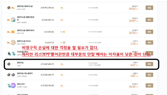 하지만 반대로 가격 변동성이 큰 코인들의 페어 예치풀들은 리스크가 어마무시하며 이자만을 받는 것만 생각할 것이 아니라 높은 이자와 내가 어쩌면 겪게 될 자산 손실의 %를 저울질하며 무엇이 나을지 고민해보는 시간이 꼭!! 필요합니다.