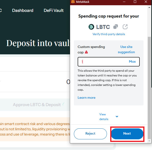3. 메타마스크에서 Vault 출금 트잭 승인 (Next -> Approve)