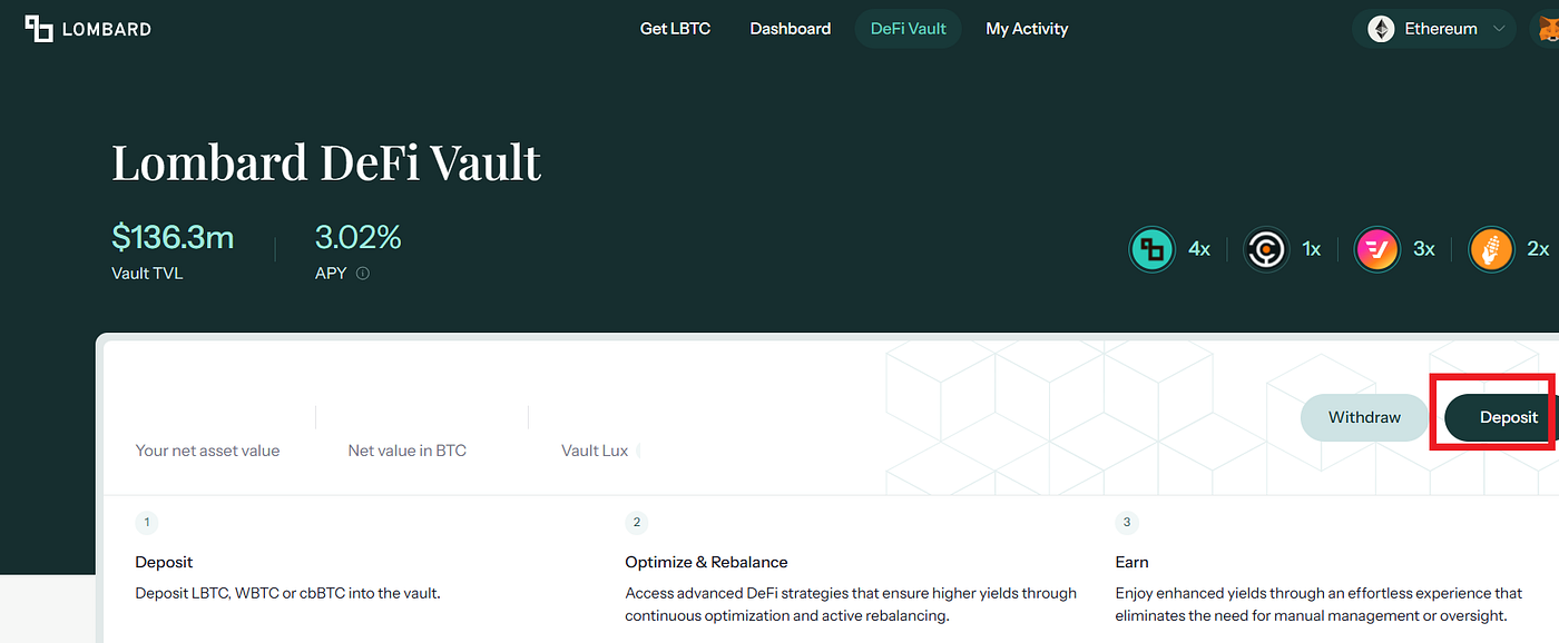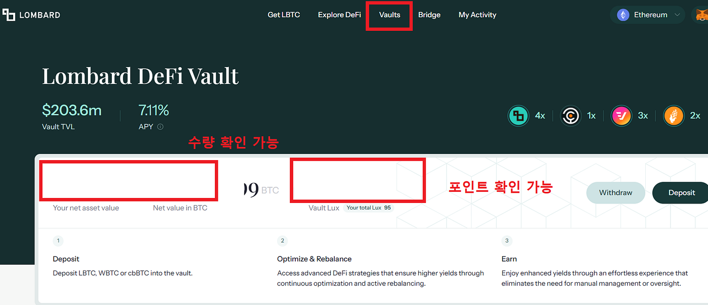 이번 가이드에서 소개하게 될 곳은 Lombard DefiValult로 비트코인 이자 + 바빌론 + 롬바드 + 베다 + 콘까지 포인트가 4중으로 파밍이 가능합니다.