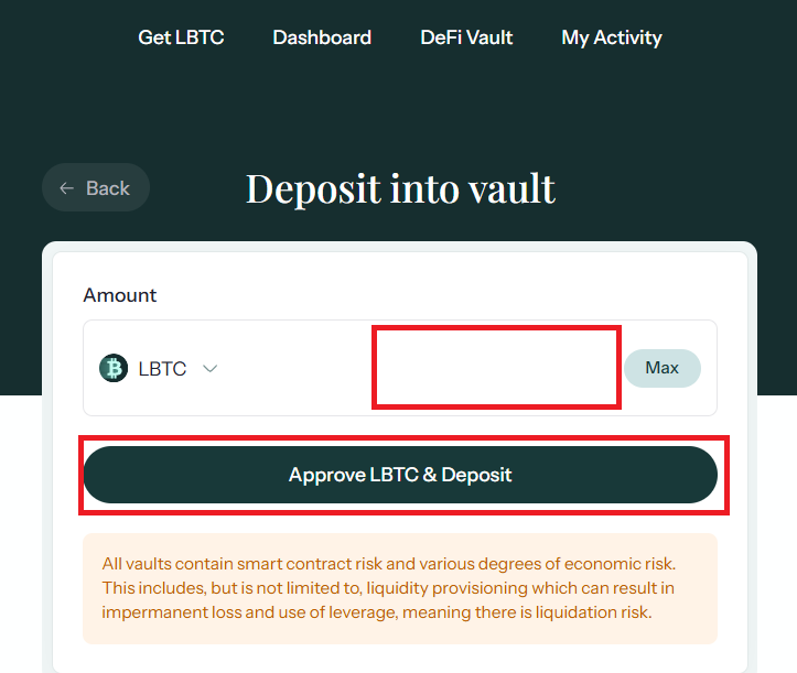 25. 뜨게 되는 화면에서 민팅한 LBTC 수량 입략, Approve LBTC & Deposit 클릭
