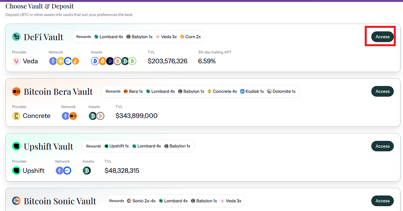 22. 가장 위의 DEFI Vault 에서 Access 클릭(비트코인 이자 6% + 바빌론 + 롬바드 + Veda + Corn을 주는 볼트입니다. 가장 추천드립니다. )