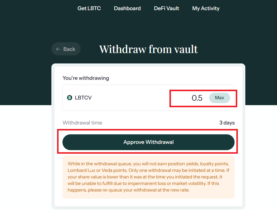 5. 3일뒤에 돌아와서 DeFi Vault 클릭, 출금 요청을 승인 (실시간으로 몇시간 남았는지 확인이 가능함)