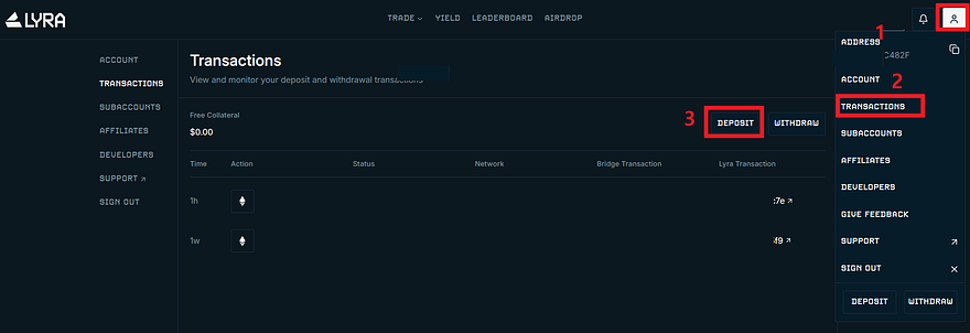 27–3 완료되면 Lyra 거래소에 USDC 입금되고 이 역시 가만히 나두기만해도 LDX 포인트 파밍이 됨. 출금이 필요할 시 반대로 Withdraw 선택 이후 출금하면 됨! (전 선물 거래용으로 소액만 입금해서 이리저리 Lyra 플랫폼 선물 연습 중)