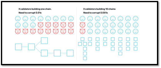 그림이 쉽게 설명해주듯이 샤딩이 없는 체인이라면 기존의 체인을 남용 혹은 해킹하기 위해서 대체적으로 전체 노드의 과반 수 이상을 조정하고 있어야한다. 하지만 샤딩으로 기존 체인을 10개의 독립적인 데이터 처리 센터(?)로 나누었을 시 당연히 해킹의 난이도도 몇 배로 줄어들게 될 것이다. 아무런 장치가 없다면 체인 자체의 보안을 담보로 처리 속도를 높이는 것이기 때문에 무척이나 위험도가 높아진다고 할 수 있다.
